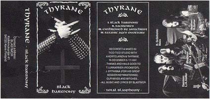 ses deux comparses. Durant l'année 1995, il cherche d'autres membres pour son groupe, et compose quelques chansons de son côté, puis en 1996, il trouve enfin des membres qui semble lui convenir en la personne de Daemon à la guitare et RG à la basse, Blastmore s'occupant des vocaux et de la batterie. Le groupe devient alors Thyrane et commence à passer aux choses sérieuses (c'est-à-dire, en fait, des répétitions plus régulières et quelques concerts !). En 1997, le groupe commence à avoir un répertoire plus conséquent et songe alors à enregistrer une démo. Il semble évident qu'un seul guitariste n'est pas suffisant, et Avather est alors engagé pour rejoindre Thyrane. Avec ce line-up au complet, le groupe entre au studio Tico-Tico (toujours en Finlande) et en ressort avec sa première démo "Black Harmony", une véritable réussite qui les fait connaître dans tout le milieu underground Finlandais. |